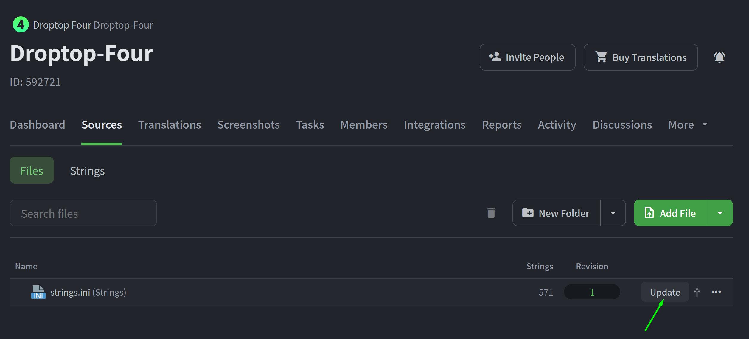 To upload new translations you'll need to go to the Crowin **Sources** tab of the project, and use the `Update` button to upload a new `strings.ini` file. If there are some conflicts a pop-up will come up asking what to maintain. The new lines will be available right away.